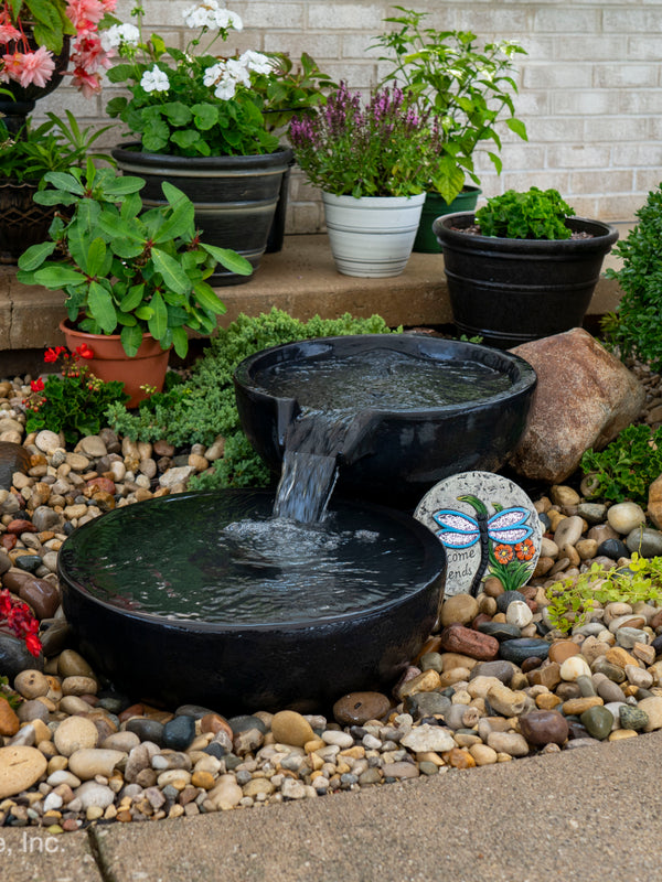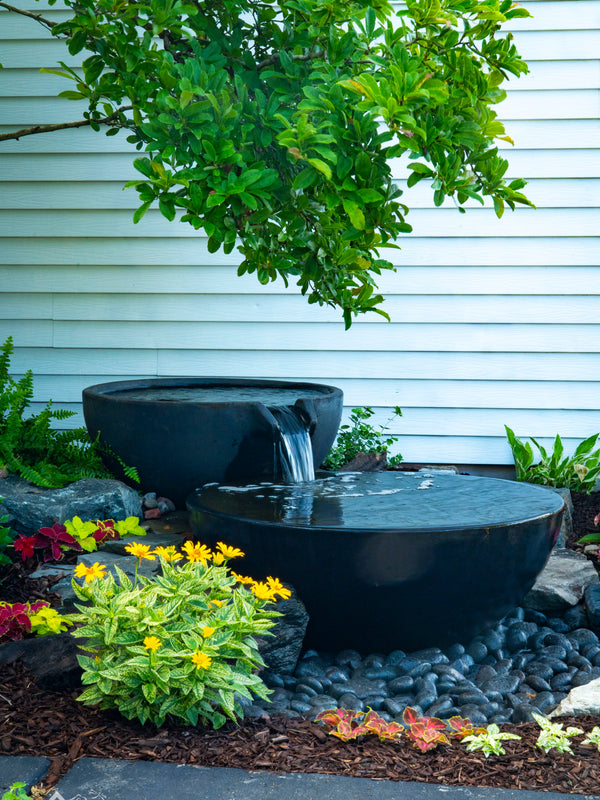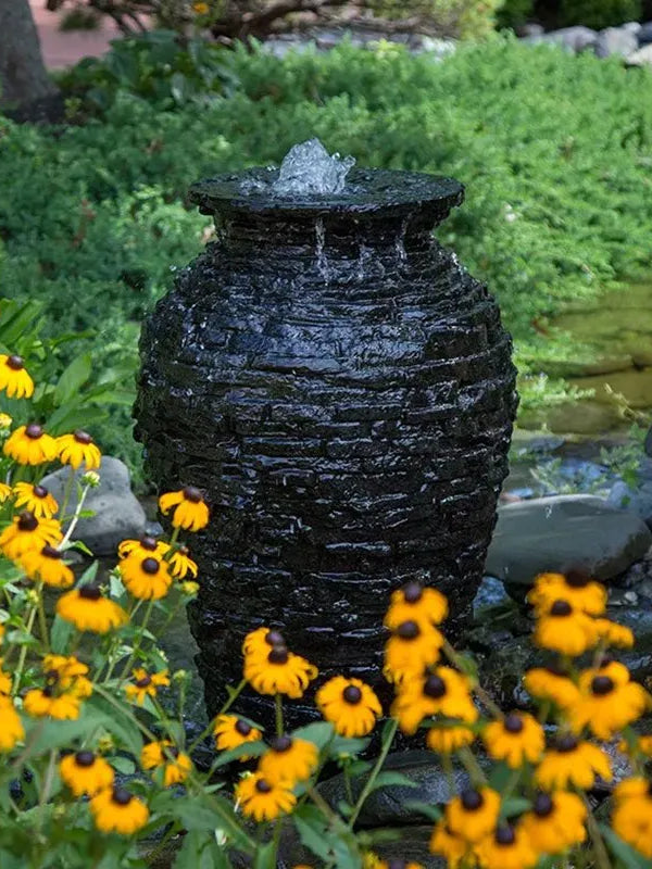 The Stacked Slate Urn Fountain Kit 24″ H (61 cm) makes it easy to add the relaxing sights and sounds of water to any location. The kit includes everything needed for quick and easy installation, including an AquaBasin® 30, plumbing, and Ultra 550 Water Pump. The lightweight, durable fiber-resin composite fountain is built to last and provides the look and beauty of real rock. Water is pumped up through the center of the fountain and gracefully cascades over the stacked slate texture, creating an impressive effect. The urn is ideal for a wide variety of installations and locations. Add the element of fire to the sphere with The Fire Fountain Add-On Kit (#78221 sold separately).