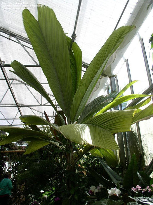Pelagodoxa henryana – Floribunda Palms & ExoticsPelagodoxa henryana, commonly known as the Marquesas Palm or Yahanna Palm, is a critically endangered, tropical, understory palm originating from Nuku Hiva in the Marquesas Islands. It features a slender trunk, large, undivided, silver-backed fronds, and produces unique, warty fruits. This species is highly prized for its ornamental, exotic appearance and is ideal for tropical landscaping, as it requires partial shade, high humidity, and consistent moisture.