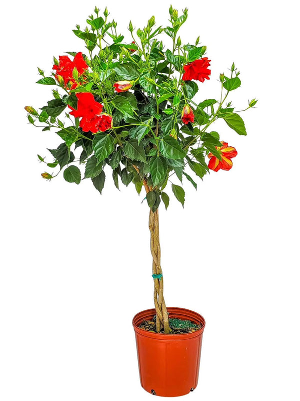 Hibiscus Assorted Braided Trunk Braided hibiscus trees are tropical, flowering plants featuring several young shrubs with stems trained and woven together, usually reaching 4-6 ft in height. They require full...