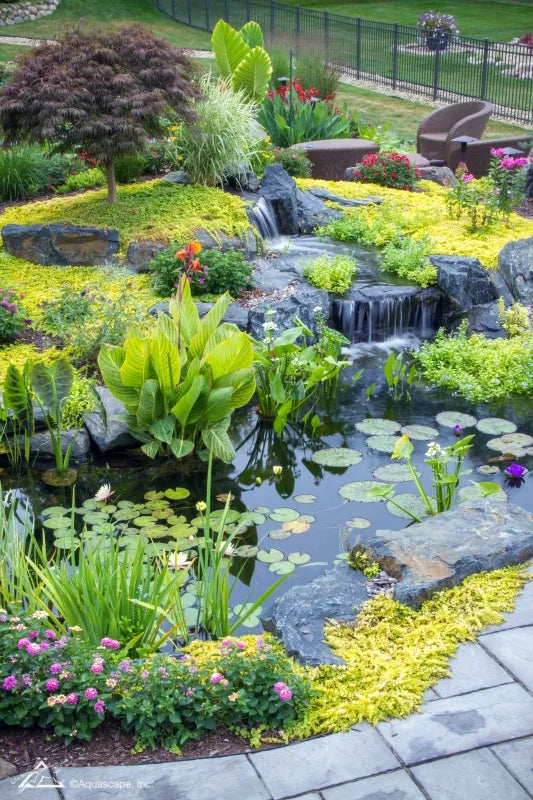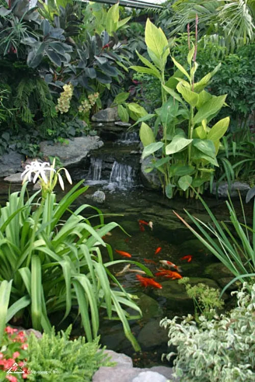 A soft, calming space is created by using different textures and shades of green foliage. The combination is effective on its own and mimics the style of a Japanese zen garden where texture takes precedence over an array of color. Play with color based on leaf selection alone, since you’ll find aquatic foliage in a range of colors such as dark green, lime green, and several variegated combinations.