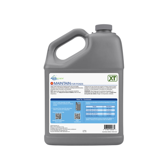 Maintain for Ponds is the #1 treatment for ponds. Aquascape Maintain for Ponds XT combines our most effective pond water treatments into one powerful formulation to successfully keep ponds clean, clear, healthy, and maintenance-free. This easy-to-use water treatment contains a powerful blend of beneficial bacteria, phosphate binder, flocculant, and pond detoxifier to support a healthy ecosystem and clear water conditions. Maintain for Ponds XT is available in half gallon and gallon options and designed only for use with the Smart Pond Dosing System XT.