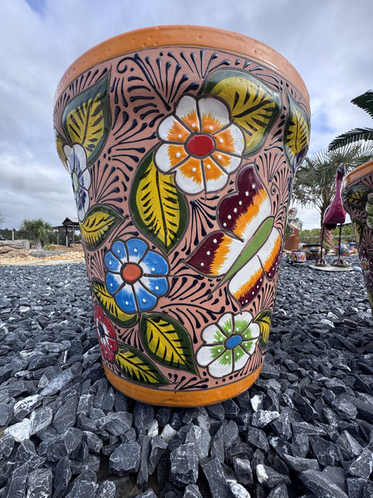 This item is a hand-painted Mexican Talavera pottery planter or vase. These ceramic pots are handcrafted by skilled artisans in Mexico and feature vibrant, colorful designs, often with intricate floral or animal patterns.