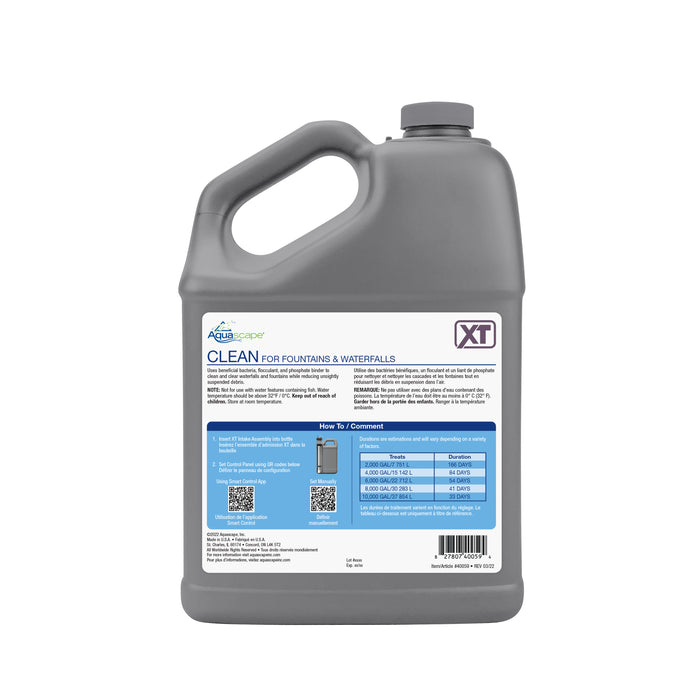 Aquascape Clean for Fountains XT effectively cleans and clarifies fountains and fountain water to keep water features clean and clear while significantly reducing maintenance and issues with water quality. Clean for Fountains XT is available in half gallon and gallon options and designed only for use with the Smart Pond Dosing System XT. This special formulation is ideal for water features with standing water, including commercial fountains and other features containing fish or plants. This easy-to-use water treatment contains a fast-acting flocculant and phosphate binder to help clump and clear suspended debris. Clean for Fountains XT also safely prevents and eliminates foam. Clean for Fountains XT is safe for fish, plants, pets, and wildlife.